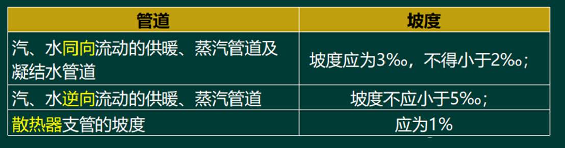 答察解析: 本题考查的是高层建筑管道施工技术要点。汽、水同向流动的热水供暖管道和汽、水同向流动的蒸汽管道及凝结水管道,坡度应为3‰,不得小于2‰。汽、水逆向流动的热水供暖管道和汽、水逆向流动的蒸汽管道,坡度不应小于5‰。散热器支管的坡度应为1%,坡度朝向应利于排气和泄水.