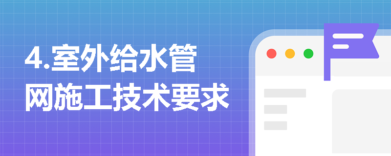(4)室外给水管网施工程序:施工准备→测量放线→管沟、井池开挖施工→管道支架制作安装(或垫层施工)→管道预制→管道安装→系统水压试验→防腐绝热→系统冲洗、消毒→管沟回填。