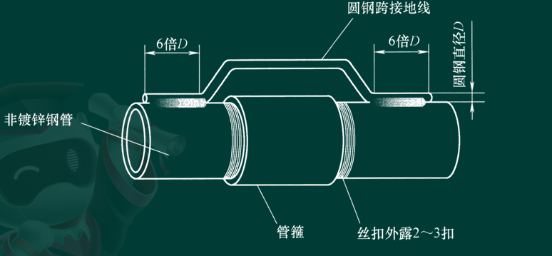 (1)当非镀锌钢导管采用螺纹连接时,连接处的两端应熔焊焊接保护连接导体,保护连接导体宜为圆钢,且直径不应小于6mm,其搭接长度应为圆钢直径的6倍。