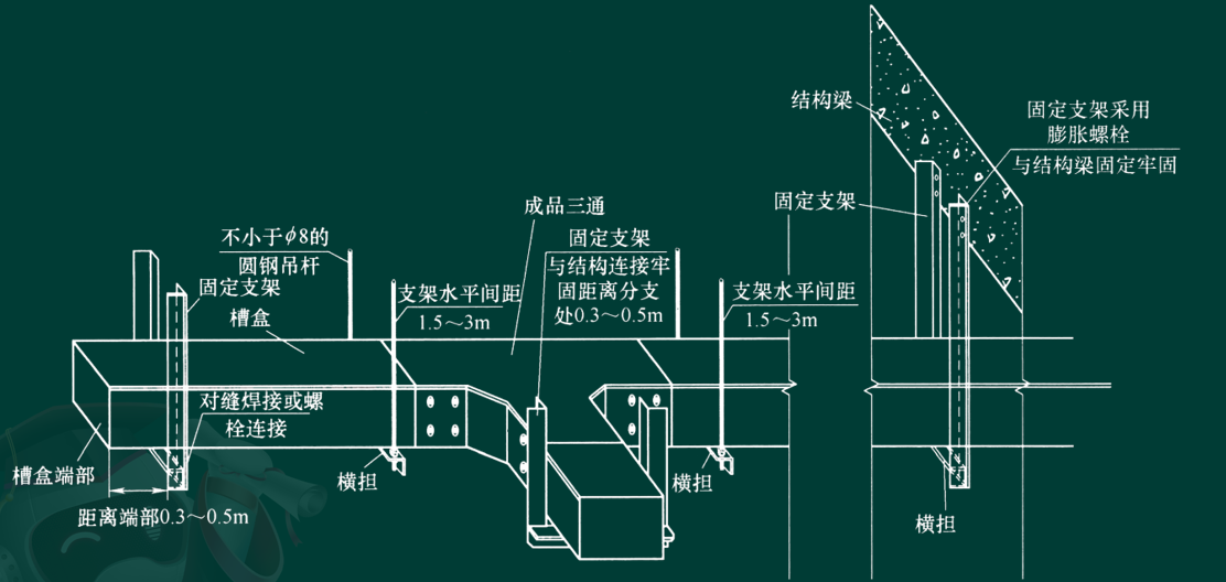 (3)在距离盒(箱)、分支处或端部0.3~0.5m处应设置固定支架。