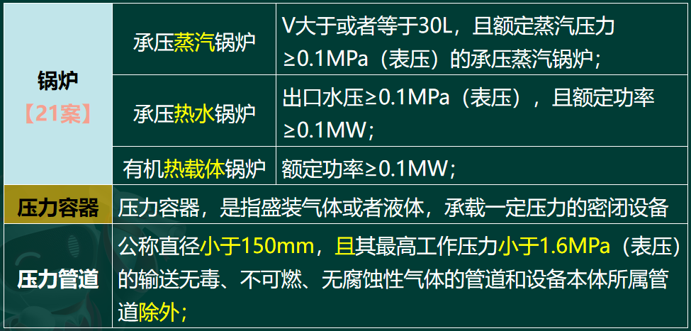主要知识点为特种设备(锅炉、压力容器、压力管道、起重机械)的定义、分类等,已在第一篇技术部分对应章节中介绍过。
