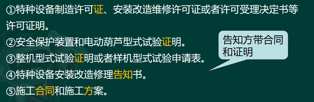 (1)特种设备安装、改造、修理的施工单位应当在施工前将拟进行的特种设备安装、改造、修理情况书面告知直辖市或者设区的市级人民政府负责特种设备安全监督管理的部门后即可施工,告知不属于行政许可。