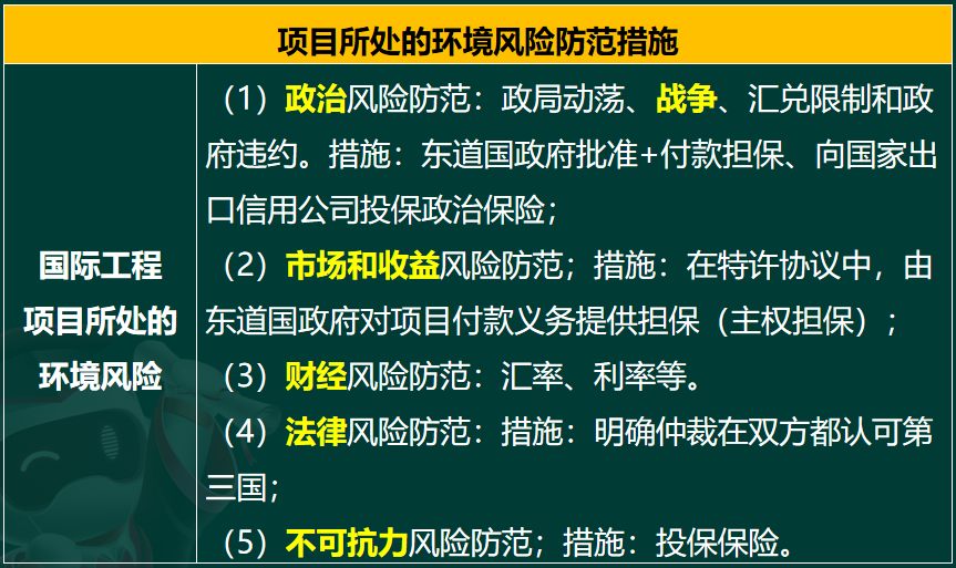 答察解析: 项目所处的环境风险防范措施:政治风险防范市场和收益风险防范。财经风险防范。法律风险防范。不可抗力风险防范。