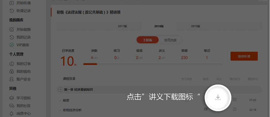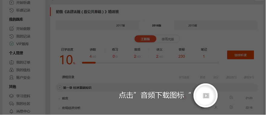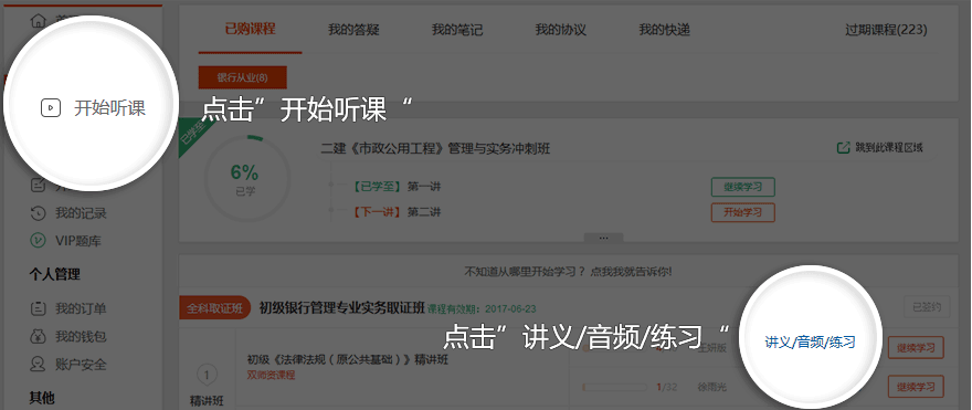 第二步:在【我的课程】点击【开始听课】,再点击右方的【讲义/音频/练习】,进入下载页面。