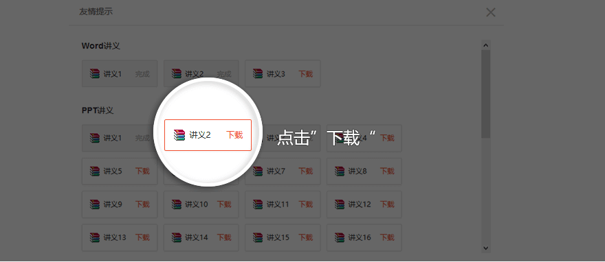 第三步:在下载页面,点击讲义下载图标,出现新弹窗。
