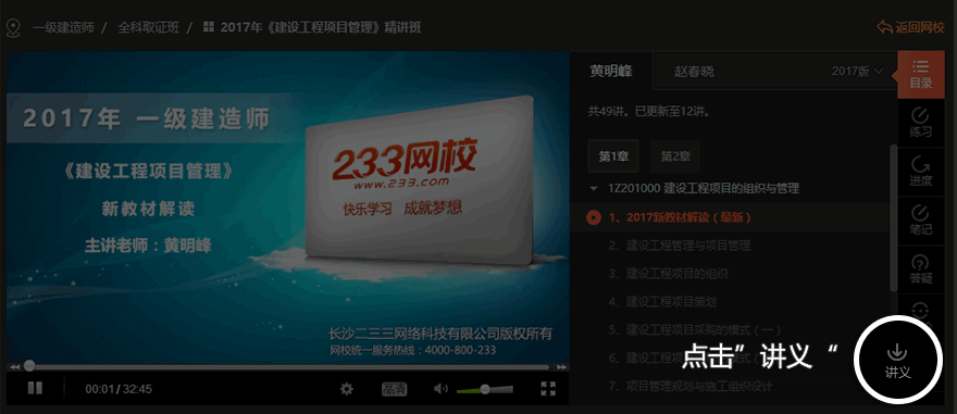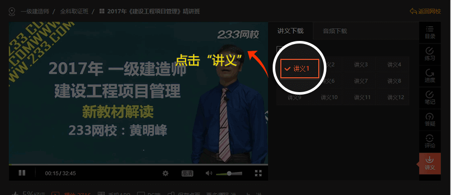 第一步:在单独的课程学习页面,点击右方的【讲义】,出现新弹窗。