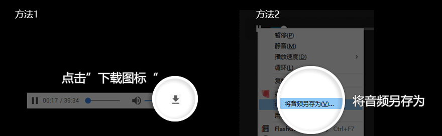 第六步:6.在新的下载页面,点击下载图标,即可下载课程音频。如在新的下载页面,未出现下载图标,即将光标移动至播放按钮处,点击右键,选择【视频另存为】或【音频另存为】,即可下载课程音频。
