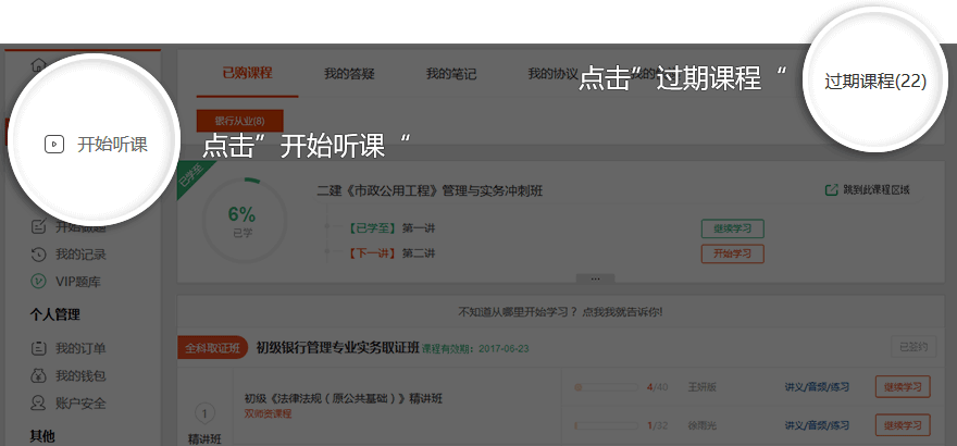 第二步:登录233网校账户,点击右上角头像进入233网校学习中心,然后在【我的课程】点击【开始听课】,再点击右上方的【过期课程】,进入过期课程页面。