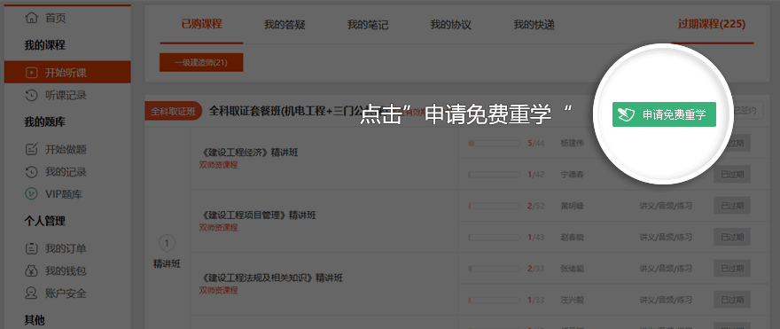 第三步:在过期课程页面,点击【申请免费重学】,进入申请重学页面。