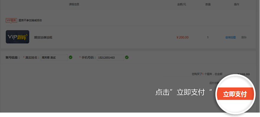 ④在结算中心,点击右下角的【立即支付】,完成支付即成功购买VIP题库。