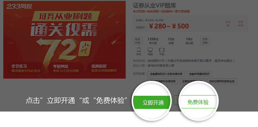 ①在233网校VIP题库,找到所属考试,进入VIP题库;在VIP题库页面,点击【立即开通】进入购买页面;点击右下角的【免费体验】进入体验页面。