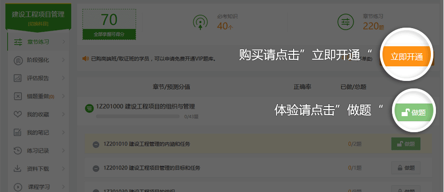 ②在体验页面,点击绿色按钮【做题】可免费体验VIP题库。点击【立即开通】进入购买页面。