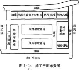 31、A公司总承包某地一扩建项目的机电安装工程,材料和设备由建设单位提供。A公司除自己承担主工艺线设备安装外,非标准件制作安装工程、防腐工程等均要分包给具有相应施工资质的分包商施工。考虑到该地区风多雨少的气候,建设单位将紧靠河边及施工现场的一所弃用学校提供给A公司项目部,项目部安排两层教学楼的一层做材料工具工作,二层作现场办公室,楼旁临河边修建简易厕所和浴室,污水直接排人河中,并对其他空地做了施工平面布置,如图2~14所示。
