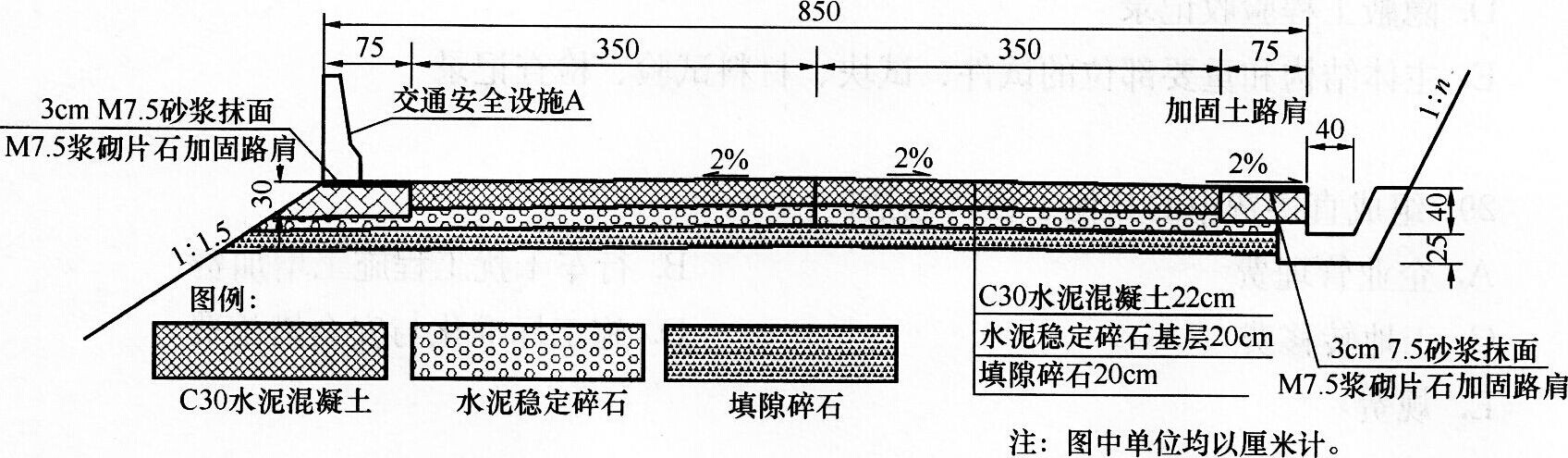 某施工单位承接了长42.5kin的山区二级公路路面施工,路线右侧濒临花溪河,属于沿溪线,河流的常水位3~4m深。路面结构如下图所示。