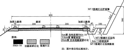 某施工单位承接了长35.8km的二级公路旧路面“白改黑”改建施工,旧路面为水泥混凝土面层,使用10年后面板破损严重,必须重建。经设计院按旧路改建设计后,将旧路面做碎石化处理,加铺SMA面层。在右侧岩层破碎的挖方路段增设碎落台和护面墙。路面结构如下图所示。