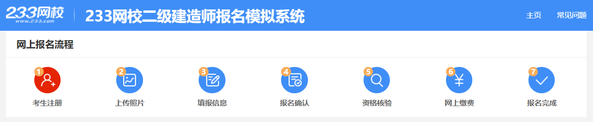 当然,建议同学们在咱们233网校的报考模拟系统提前体验一下报名流程>>点击进入二建报考模拟系统