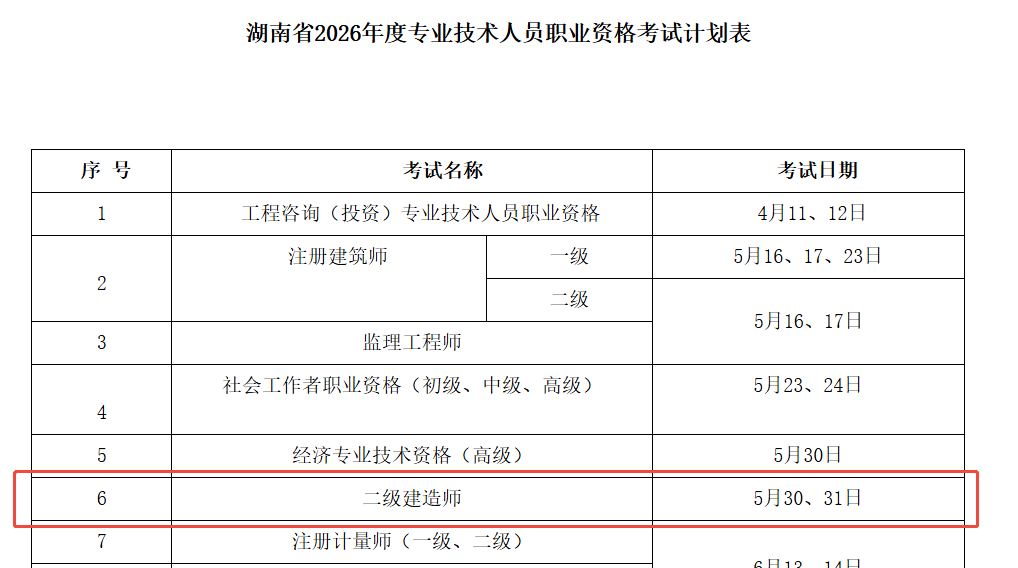 2026年湖南二级建造师考试时间是什么时候?根据湖南人事考试网发布的《湖南省2026年度专业技术人员职业资格考试计划表》,2026年湖南二级建造师资格考试安排在5月30日、31日。