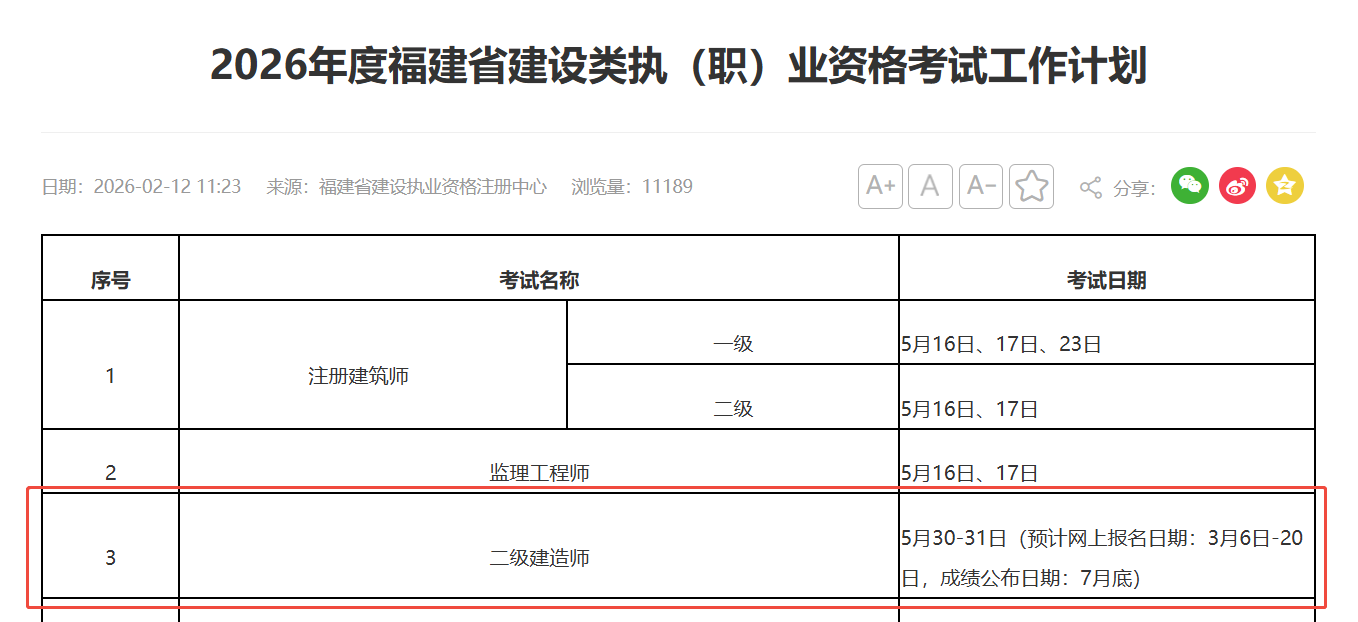 2026年2月12日,福建省住房和城乡建设厅发布《2026年度福建省建设类执(职)业资格考试工作计划》,2026年福建二级建造师考试时间5月30日、31日。