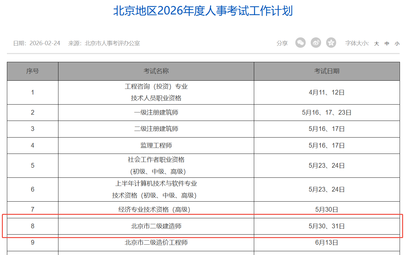 2026年2月24日,北京市人力资源和社会保障局公布《北京地区2026年度人事考试工作计划》,2026年北京二级建造师考试时间为5月30日、31日。