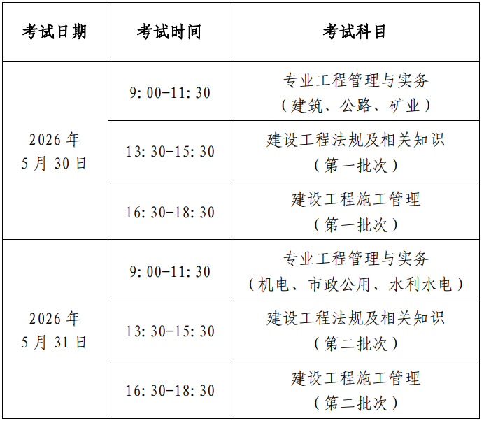 考试设置《建设工程施工管理》《建设工程法规及相关知识》和《专业工程管理与实务》3个科目。《专业工程管理与实务》科目分为:建筑工程、公路工程、水利水电工程、市政公用工程、矿业工程和机电工程6个专业类别,考生报名时可根据实际工作选择其一。