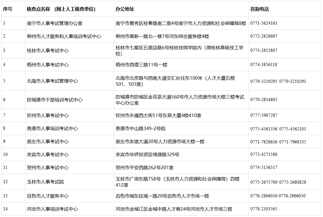全区人事考试组织机构(核查点)地址及联系方式如下: