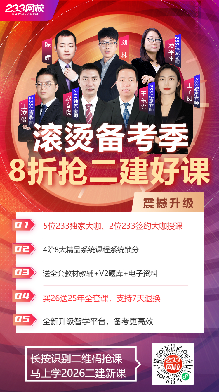2026年二级建造师教材预计每科变动20%-30%,且部分新增、修改内容将成为考试考查重点!根据往年规律,教材变化点即重要考点!因此,233网校也将在教材发布当天邀请二建讲师团队为大家进行直播解读新教材变化,大家可以提前预约2026年版二建教材变化解读直播!