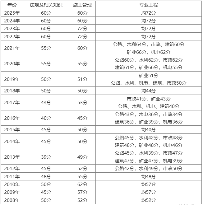 贵州历年二级建造师合格标准如下: