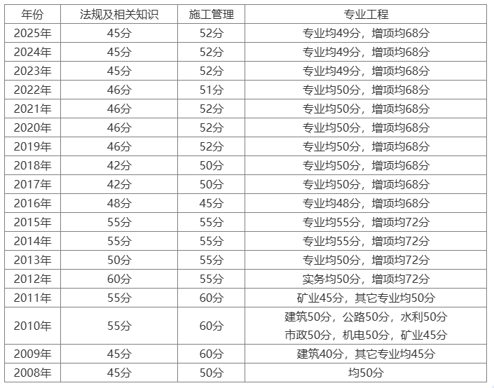 2026年至2028年,云南省二级建造师执业资格考试实行固定合格标准。具体包括:建设工程施工管理52分,建设工程法规及相关知识50分,专业工程管理与实务(主项)55分,专业工程管理与实务(增项)65分。