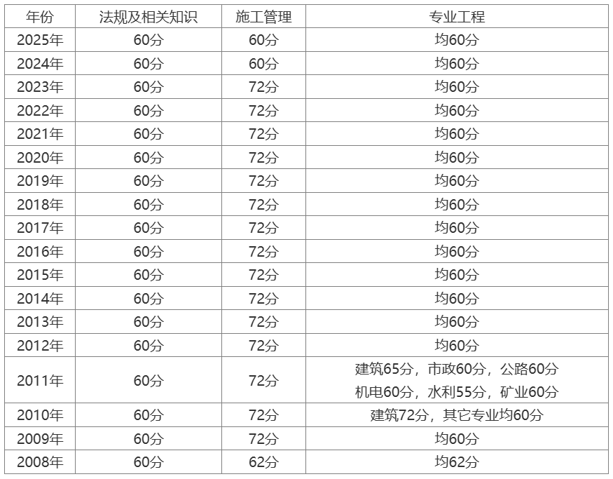 湖南历年二级建造师合格标准如下: