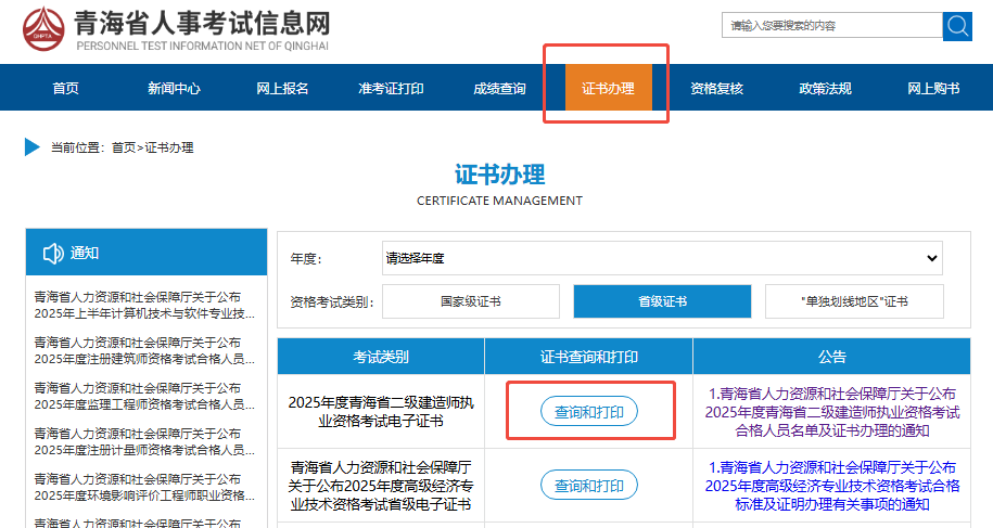 2、在 “证书办理” 栏目中选择对应年份的二级建造师考试,点击 “查询和打印”。