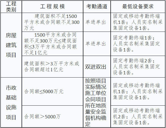 注:1.此标准为最低配备标准。对于用工人员多的施工作业工程,以上配备标准不能满足实名制管理需求的,施工单位可自行增加所需设备,新增设备不允许为移动设备。