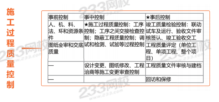 (1)施工过程质量控制。包括工序控制(一般工序控制和特殊工序控制) ;工序之间的交接检查的控制;隐蔽工程质量控制;调试和检测、试验等过程控制。