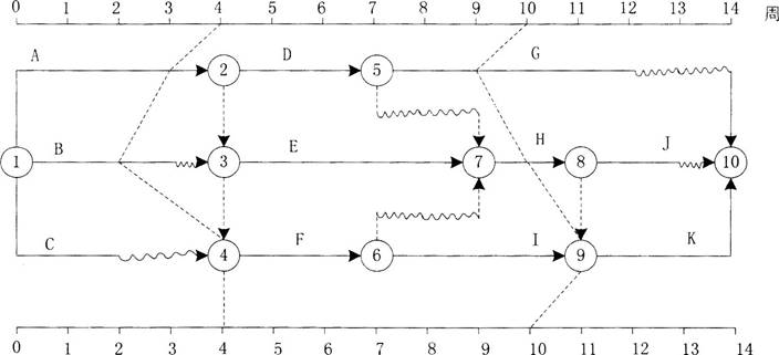 5、某工程项目的双代号时标网络计划,当计划执行到第4周末及第10周末时,检查得出实际进度前锋线如下图所示,检查结果表明()。