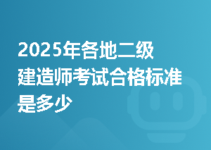 2025年二级建造师考试合格标准因地区而异,部分已公布的省份合格标准具体如下: 插入模块 2025年各地二级建造师考试合格标准 查看更多>