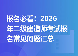 2026年二级建造师考试报名时间主要集中在2-3月份!233网校为二建考生整理了一些报考常见问题,希望能帮助大家答疑解惑,顺利完成2026年二级建造师报名环节,建议收藏本文!扫码入群↓↓↓二建报名答疑,全程指导,助您报名成功!如何查看我的收藏?【打开233网校APP→我的→我的收藏/记录/关注→头条收藏】报名条件类2026年二级建造师考试各地报名条件汇总2026年二建报考条件解读:工程类、工程经济类专业有哪些?2026年二建报考条件解读:学历学位要求是什么?2026年二建报考条件解读:从事建设工查看更多>