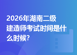 2026年2月11日,湖南人事考试网发布《湖南省2026年度专业技术人员职业资格考试计划表》,2026年湖南二级建造师资格考试安排在5月30日、31日。具体如下:插入模块湖南省2026年度专业技术人员职业资格考试计划表序 号考试名称考试日期1工程咨询(投资)专业技术人员职业资格4月11、12日2注册建筑师一级5月16、17、23日二级   5月16、17日3监理工程师4社会工作者职业资格(初级、中级、高级)5月23、24日5经济专业技术资格(高级)5月30日6二级建造师5月3查看更多>