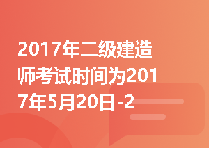 二级建造师考试为全国统考,统一时间,统一大纲。  2017年二级建造师考试时间为2017年5月20日-21日。  考试时间安排如下:  2017年5月20日  上午  09:00~12:00   建设工程施工管理    下午  14:00~16:00   建设工程法规及相关知识  2017年5月21日  上午  09:00~12:00   专业工程管理与实务(6个专业)  应试人员必须同时持准考证和第二代身份证原查看更多>
