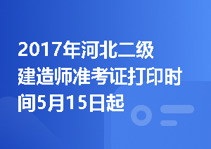 根据《2017年河北二级建造师考试报名公告》,2017年河北二级建造师考试准考证打印时间为5月15日起。【2017年河北二级建造师准考证打印入口】查看更多>