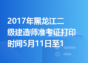 2017年黑龙江二级建造师准考证打印时间5月11日-5月17日。  本次考试实行网上打印准考证。考生按时登录黑龙江省人事考试网(http://link.233.com/20064)的“准考证打印”栏目,按要求录入相关信息即可打印。【2017年黑龙江二级建造师准考证打印入口】  考生打印准考证后,请仔细核对准考证上相关信息,如有问题须在准考证打印截止日期前与报名考区的考试管理机构联系。[NoPage]查看更多>