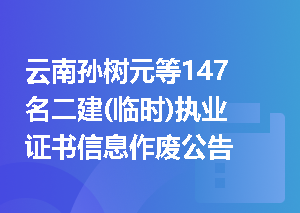云南省住房和城乡建设厅关于二级建造师(临时)执业证书作废的公告根据《注册建造师管理规定》(建设部令第153号)和《云南省建设厅关于印发〈云南省二级注册建造师管理暂行规定〉的通知》(云建建〔2007〕408号)有关要求,现将年龄超过65周岁(截止2019年4月30日)的孙树元等147名人员二级建造师(临时)执业证书信息予以公布(详见附件)。以上二级建造师(临时)执业证书自2019年5月1日起作废。特此公告。附件 年龄超过65周岁人员二级建造师(临时)执业证书信息.xls云南省住房和城乡建设厅201查看更多>