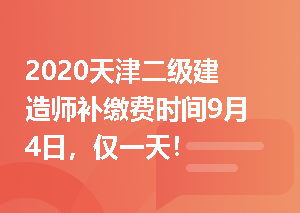 2020天津二级建造师考试补缴费时间2020年9月4日,之前没来得及缴费的报考人员抓紧时间缴费吧!【2020天津考务通知】进入天津二建缴费入口资料下载>>【2014-2019年各科真题】 【题库试题】 【考前精品资料免费下载】2020天津二级建造师考试时间及科目10月31日上午 9:00-12:00 建设工程施工管理;10月31日下午14:00-16:00 建设工程法规及相关知识;11月1日上午9:00-12:00 专业工程管理与实务。其中《专业工程管理与实务》科查看更多>