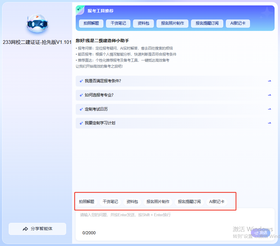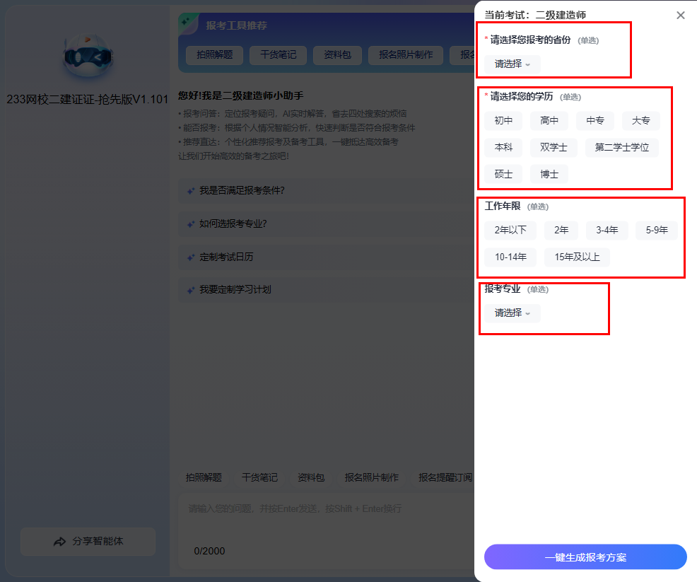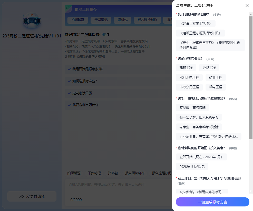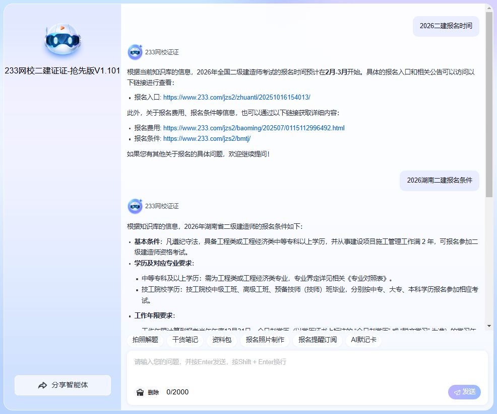 2026年二级建造师考试报名即将启动,你是否还在为报考条件、流程细节、备考规划而焦虑?现在,这些问题都有了解决方案——「二建AI报考助手」全新上线!它集实时智能问答、报考条件分析、备考个性化规划于一体,7×24小时为你答疑解惑,助你省时省力,走稳二建报考第一步。