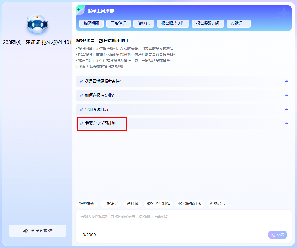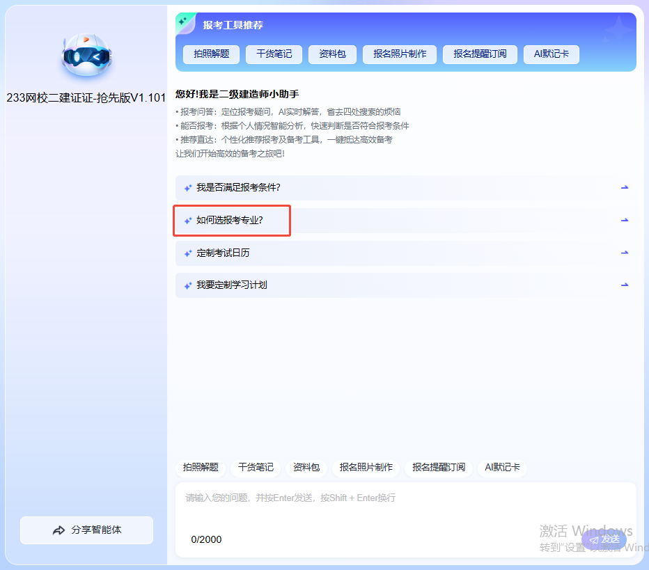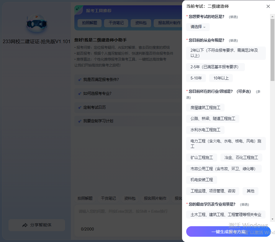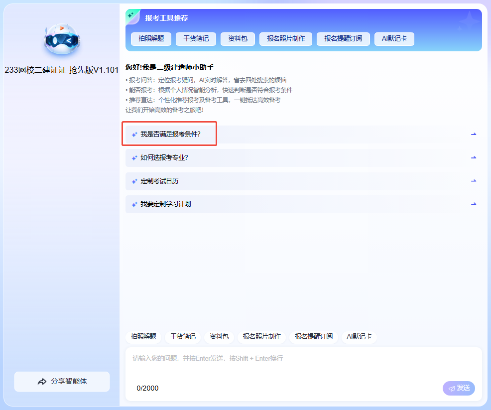 2026年二级建造师考试报名即将启动,你是否还在为报考条件、流程细节、备考规划而焦虑?现在,这些问题都有了解决方案——「二建AI报考助手」全新上线!它集实时智能问答、报考条件分析、备考个性化规划于一体,7×24小时为你答疑解惑,助你省时省力,走稳二建报考第一步。