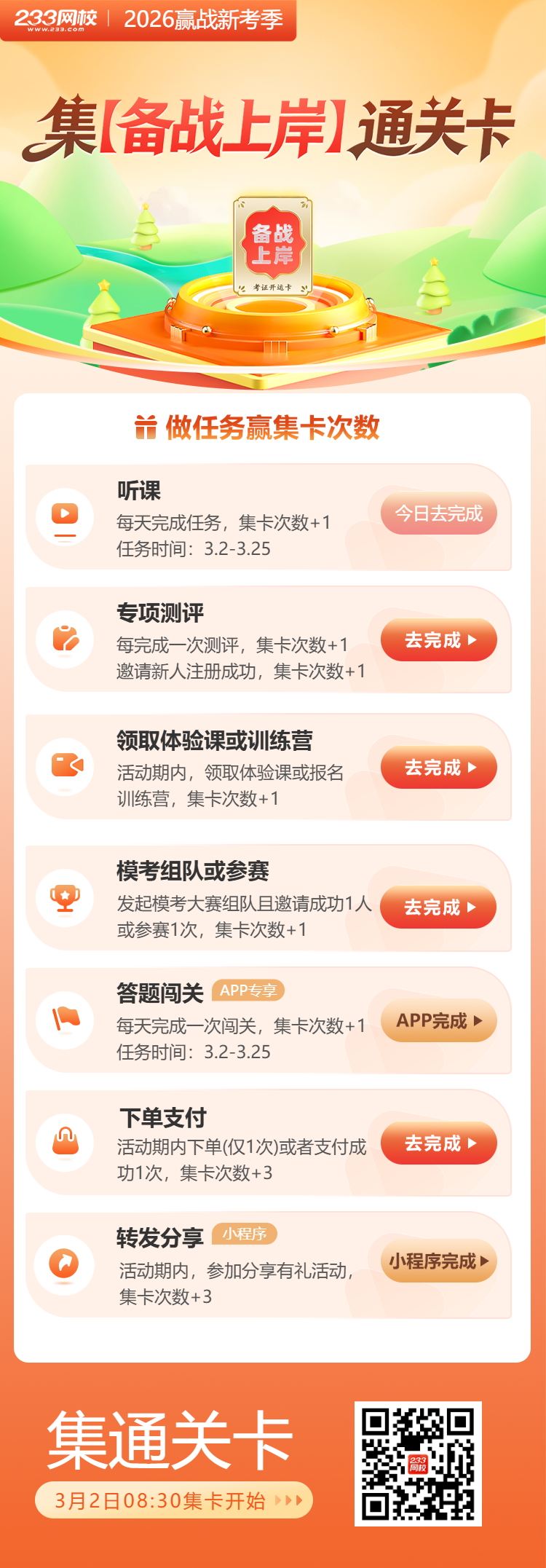 3月2日-25日,只要集齐“备战上岸”四张卡,就能参与拼手气开奖。