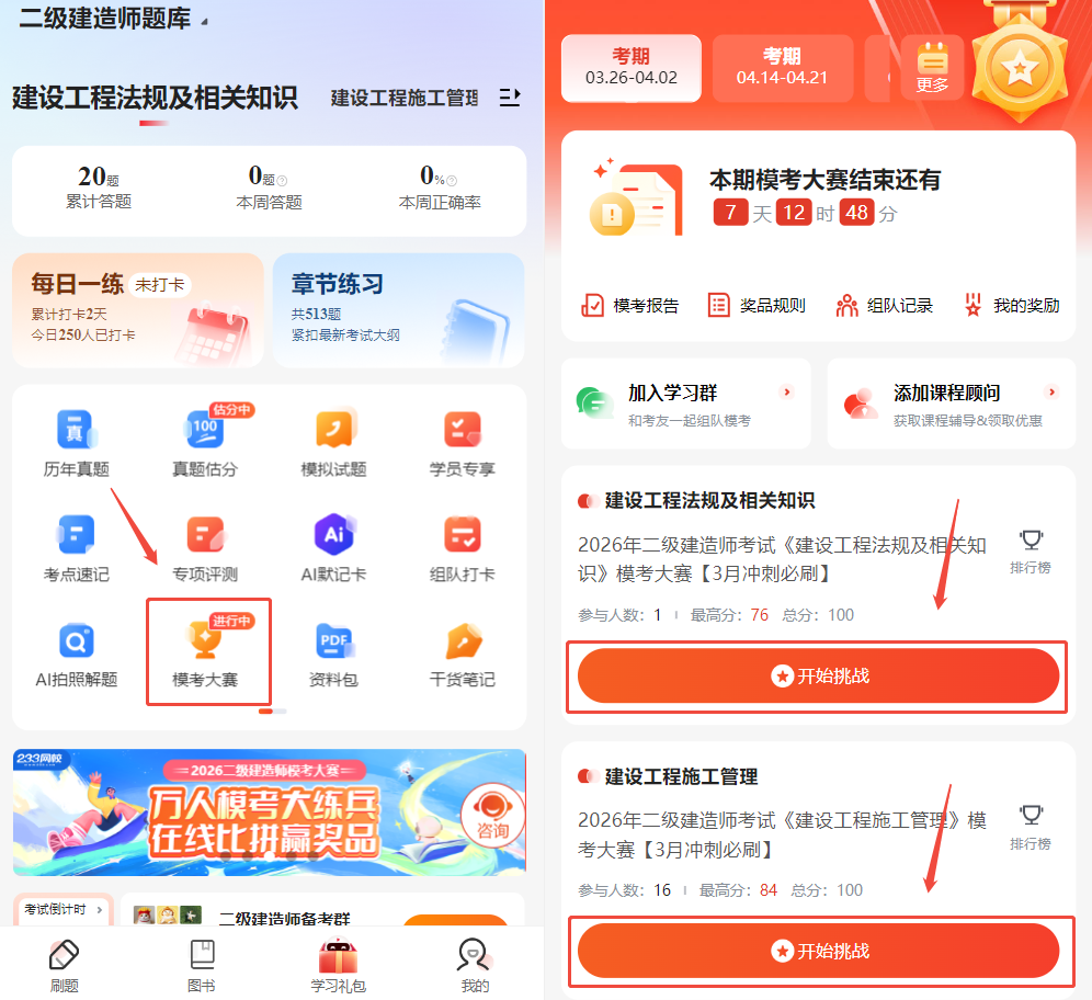 2026年二建备考已进入关键冲刺期,想要自测真实水平、高效查漏补缺、快速提升分数?3月26日-4月2日,2026二建模考大赛【冲刺必刷卷】 火热开赛,8大科目全覆盖,等你来战!