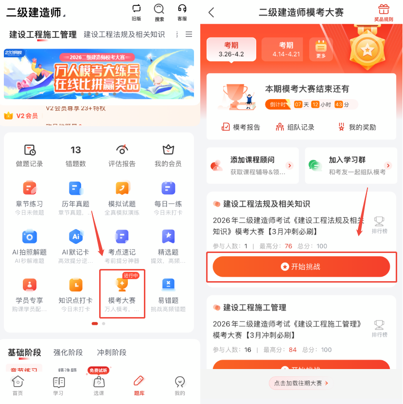 ▲APP参赛流程: 打开233网校APP——选择【二级建造师】——进入【题库】——进入【模考大赛】——选择对应科目参赛。