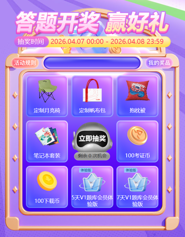 虚拟奖品:100考证币、100下载币、7天V1题库会员体验版、5天V1题库会员体验版。