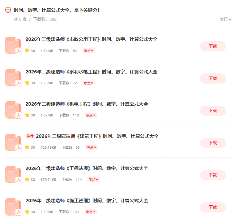 方式一:在233网校二级建造师资料包中,资料类型选择“公式大全”,下载二建《时间、数字、计算公式大全》资料PDF版,可打印出来进行学习。点击进入资料包>>