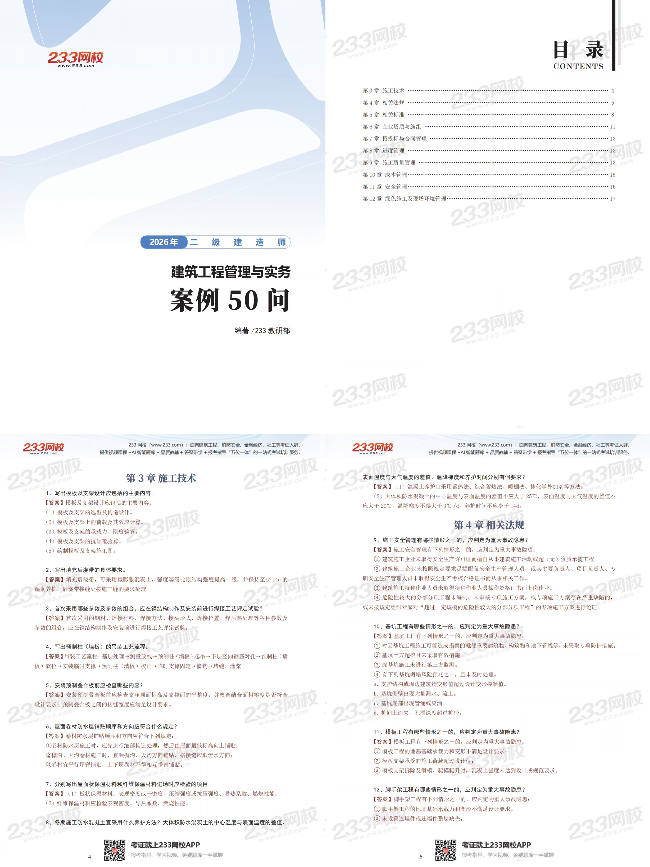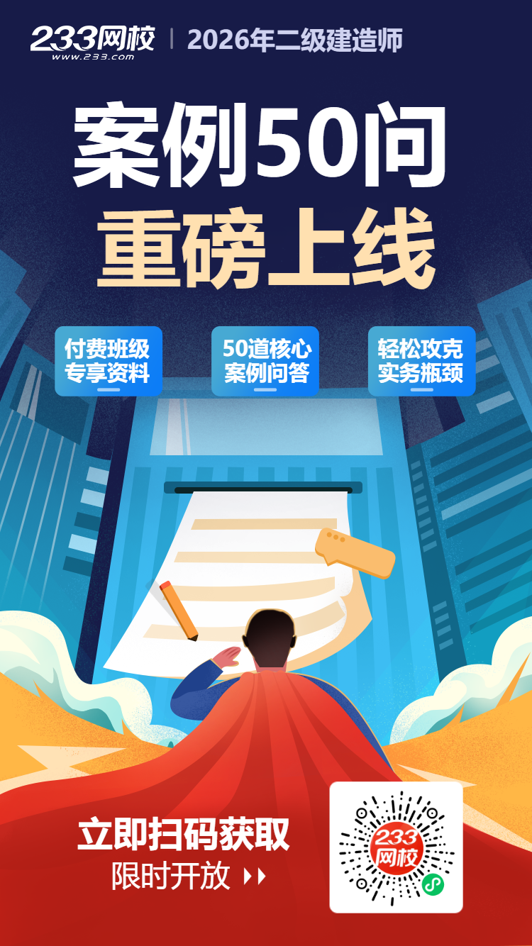2026年二级建造师实务科目《案例50问》为233网校付费班级专享资料,浓缩实务案例高频核心考点,拒绝啃厚书、不刷海量题。50道核心问答,一问一答直接背,考点清晰、重点突出,考场遇到同类题直接套用答案,案例题稳稳拿分!