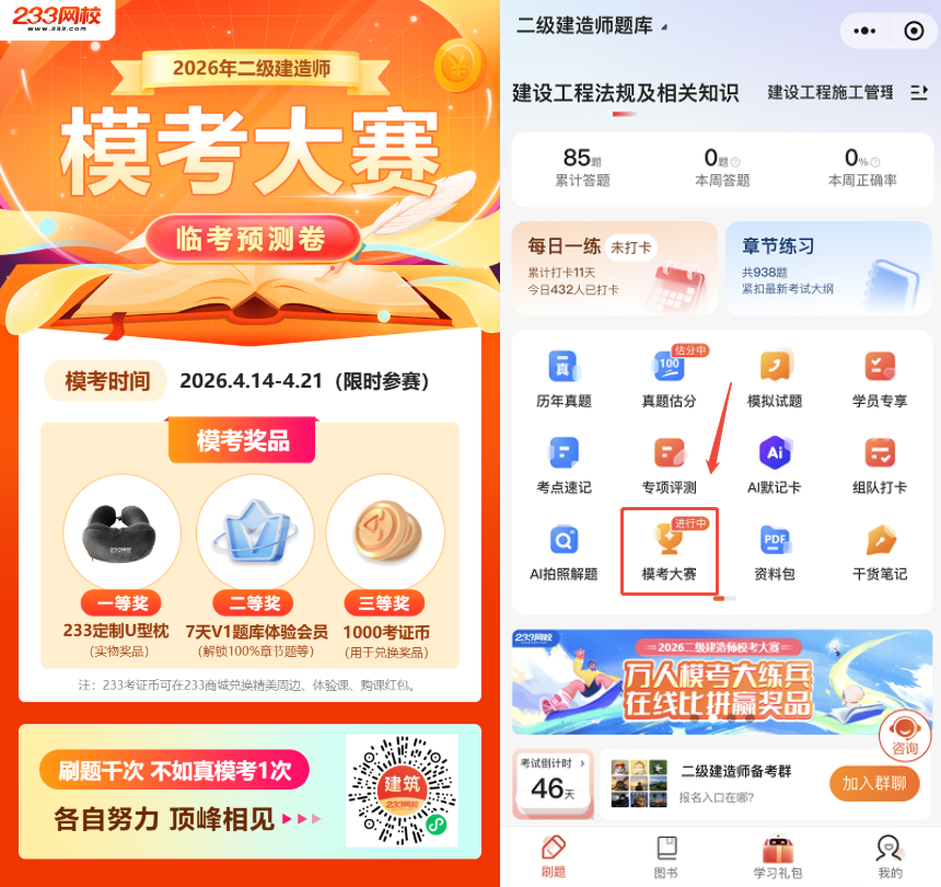 参与方式:登录233网校APP/小程序,进入「二建题库-模考大赛」入口,一键报名参赛!